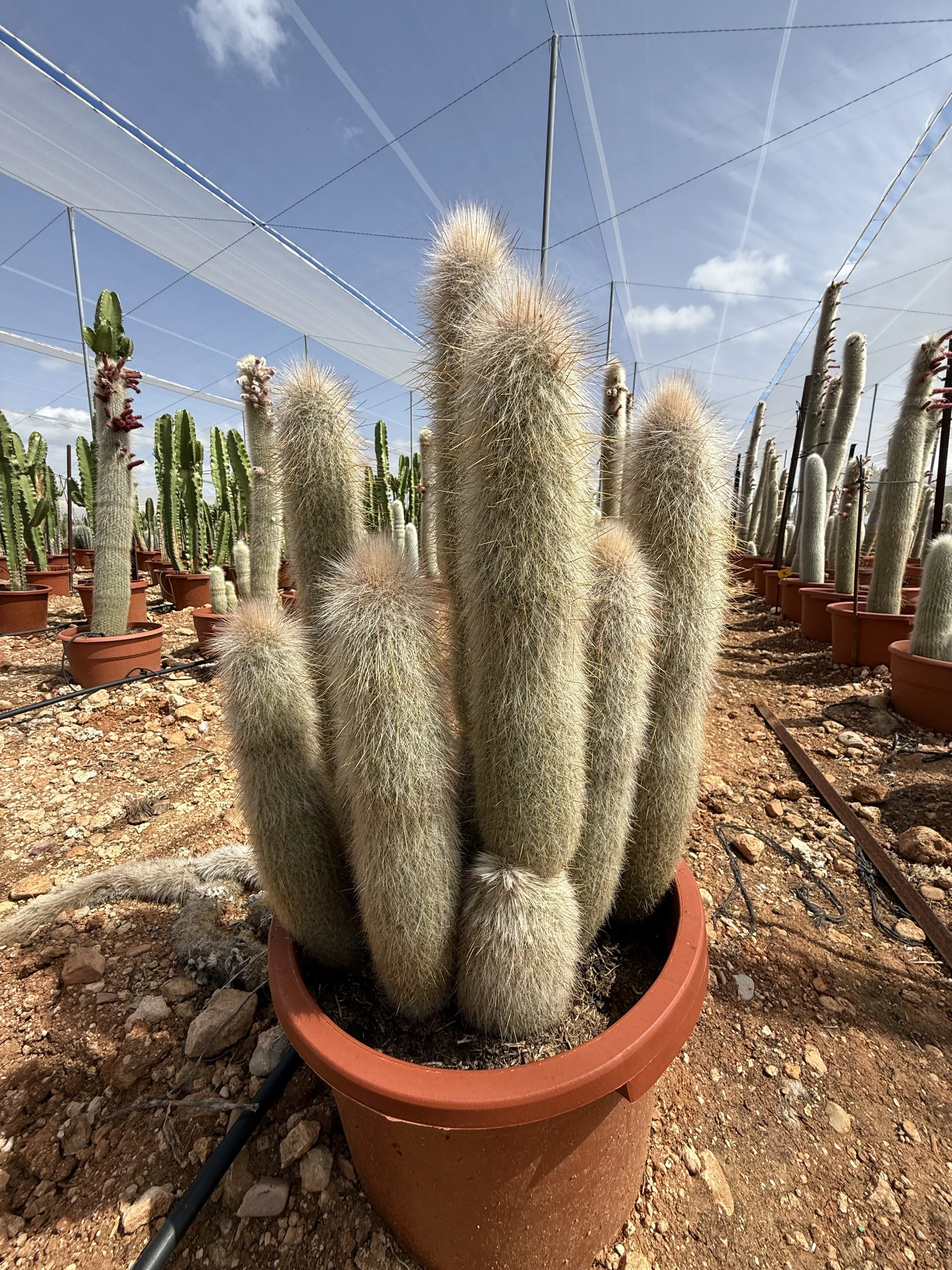 Uso paisajístico: De porte columnar-globoso, muy robusto y visualmente impactante. La combinación de sus espinas de color rojo intenso con los filamentos blancos (pelos) que surgen de sus areolas lo convierte en una pieza central para cualquier xerojardín. Excelente como ejemplar aislado.